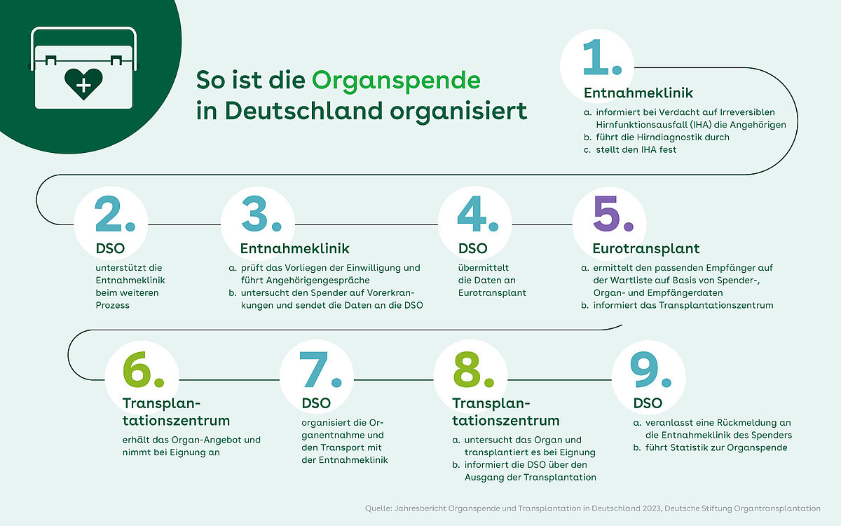 Wie die Organspende und Transplantation in Deutschland organisiert sind, regelt das Gesetz über die Spende, Entnahme und Übertragung von Organen und Geweben (Transplantationsgesetz, TPG). Dabei trennt es die Bereiche Organspende, Organvermittlung und Organübertragung, also die Transplantation, streng organisatorisch und personell voneinander. Jeder dieser Bereiche ist bei einer anderen Einrichtung angesiedelt. So koordiniert die Deutsche Stiftung Organtransplantation (DSO) die postmortale Organspende in Zusammenarbeit mit den Entnahmekrankenhäusern. Die Stiftung Eurotransplant ist für die Zuteilung von Spenderorganen nach medizinischen Auswahlkriterien in acht europäischen Ländern verantwortlich. Die Transplantationszentren führen die Wartelisten und transplantieren gespendete Organe.