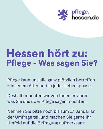 Das Hessische Ministerium für Familie, Senioren, Sport, Gesundheit und Pflege fragt nach: Was sagen die Hessinnen und Hessen zum Thema Pflege? Dazu hat das Ministerium eine Umfrage gestartet, die noch bis zum 17. Januar online ist.