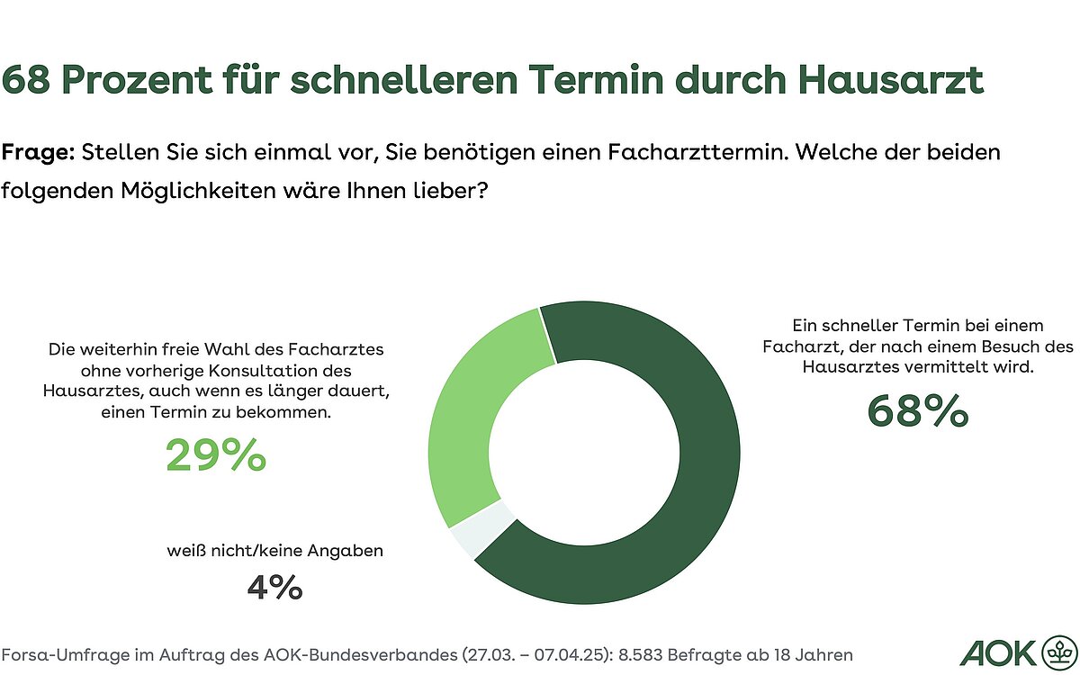 Eine breite Mehrheit in der Bevölkerung unterstützt die Stärkung der Primärversorgung, wenn damit Vorteile beim Zugang zur medizinischen Versorgung verbunden sind. Eine aktuelle Forsa-Umfrage im Auftrag der AOK zeigt: 68 Prozent der Deutschen würden die freie Arztwahl Jeder Patient hat das Recht, den (Zahn-)Arzt seines Vertrauens frei zu wählen. Dieses Recht kann aus… gegen schnellere Termine tauschen. Auch wenn es in der Ärzteschaft eine rege Diskussion zur Ausgestaltung der Primärversorgung gibt, werden dort überwiegend Vorteile und Chancen gesehen, da auch die Fachärztinnen und -ärzte ein großes Interesse daran haben, nur die für sie relevanten Fälle zu behandeln. Grundlage einer verbindlichen Versorgungssteuerung ist aus Sicht der AOK-Gemeinschaft ein flächendeckendes, strukturiertes Ersteinschätzungssystem, das an allen relevanten Stellen des Versorgungssystems einheitlich und verbindlich angewendet wird – sowohl in der Primärversorgung als auch über die Rufnummer 116 117 im Rahmen der Akut- und Notfallversorgung. So können Patientinnen und Patienten zukünftig zielgerichtet und bedarfsgerecht in der richtigen Versorgungsebene behandelt werden.