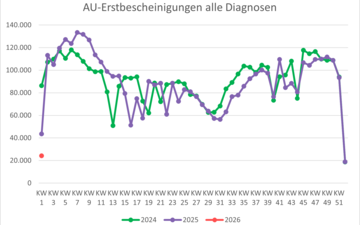 | Alle Erstkrankschreibungen (alle Diagnosen) | 109.948 | 111.729 | 108.746 | 93.483 | 18.960 | 24.255 |