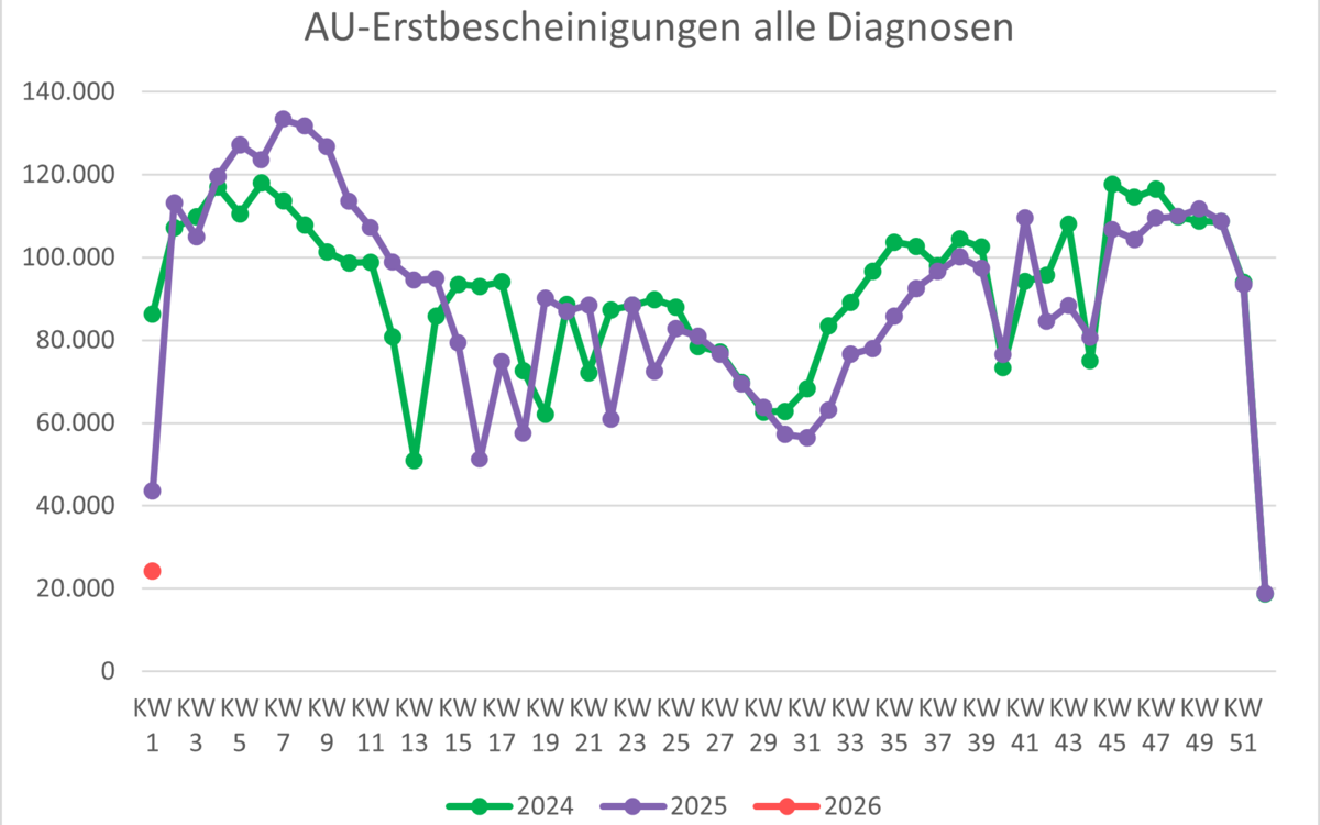 | Erstkrankschreibungen absolute Fallzahlen | 48. KW 2025 | 49. KW 2025 | 50. KW 2025 | 51. KW 2025 | 52. KW 2025 | 01. KW 2026 |