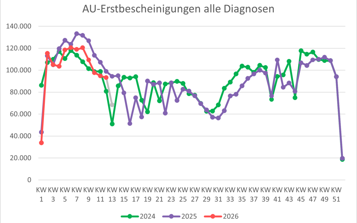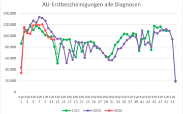 | Alle Erstkrankschreibungen (alle Diagnosen) | 120.469 | 109.386 | 97.724 | 94.860 | 93.184 | 68.435 |