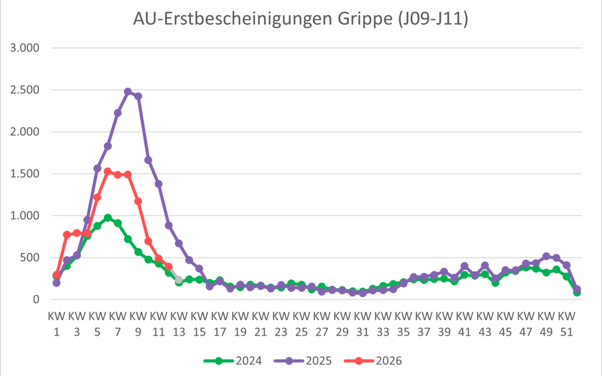 | Krankschreibungen aufgrund von Grippe (ICD (J09-J11) | 1.490 | 1.169 | 694 | 489 | 391 | 232 |