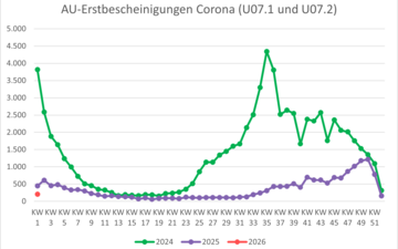 - Personen mit fortbestehender Arbeitsunfähigkeit mit Erkrankungsbeginn in den Vorwochen (sog. Folgebescheinigungen) hier nicht enthalten, Aussagen zur Dauer der Krankschreibungen und zur Erkrankungsschwere daher hier nicht ableitbar.
