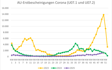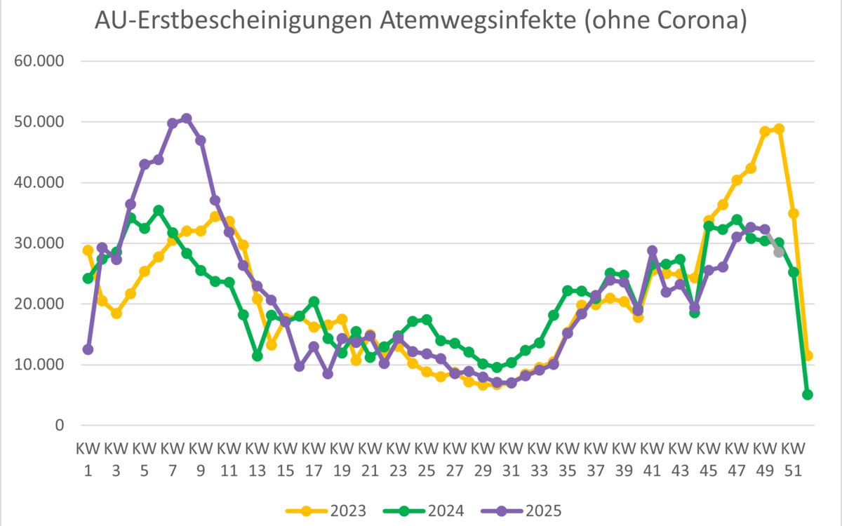 | Krankschreibungen aufgrund von Atemwegsinfektionen (ohne Corona-Fälle) | 25.527 | 26.123 | 30.999 | 32.600 | 32.296 | 28.478 |