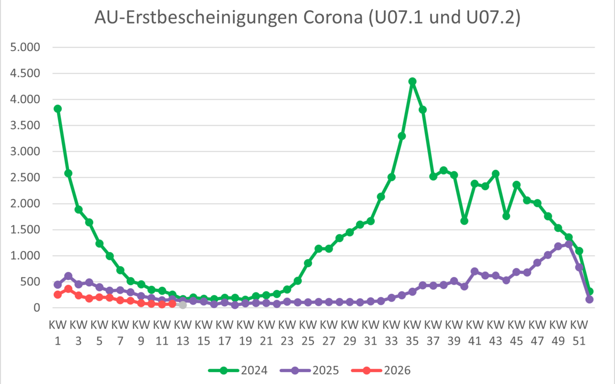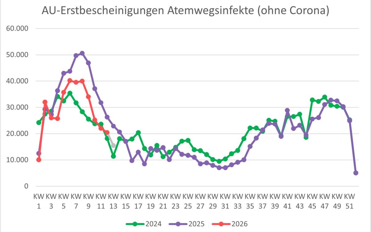 | Krankschreibungen aufgrund von Atemwegsinfektionen (ohne Corona-Fälle) | 39.967 | 33.980 | 25.195 | 21.998 | 20.486 | 15.443 |