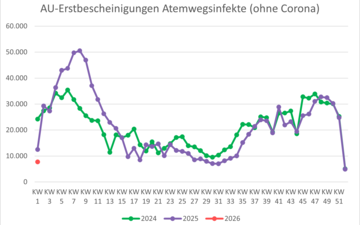 | Krankschreibungen aufgrund von Atemwegsinfektionen (ohne Corona-Fälle) | 32.724 | 32.459 | 30.237 | 24.819 | 4.910 | 7.726 |