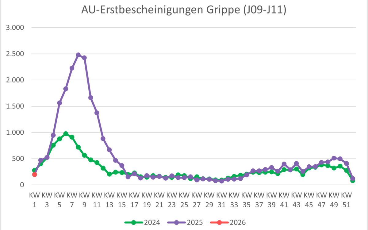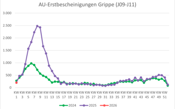 | Krankschreibungen aufgrund von Grippe (ICD (J09-J11) | 437 | 513 | 495 | 409 | 123 | 198 |