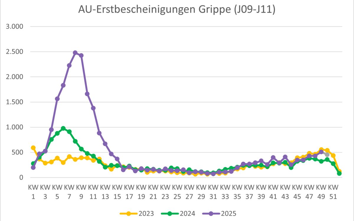 | Krankschreibungen aufgrund von Grippe (ICD (J09-J11) | 348 | 350 | 431 | 432 | 508 | 454 |