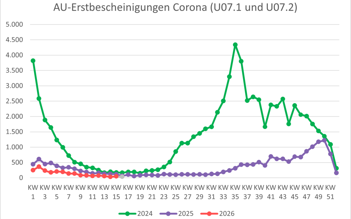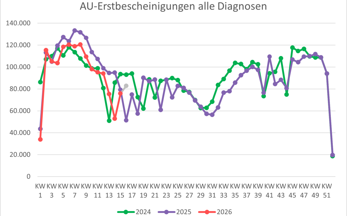 | Erstkrankschreibungen absolute Fallzahlen | 11. KW 2026 | 12. KW 2026 | 13. KW 2026 | 14. KW 2026 | 15. KW 2026 | 16. KW 2026 |