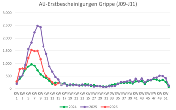| Krankschreibungen aufgrund von Grippe (ICD (J09-J11) | 493 | 393 | 255 | 156 | 227 | 185 |