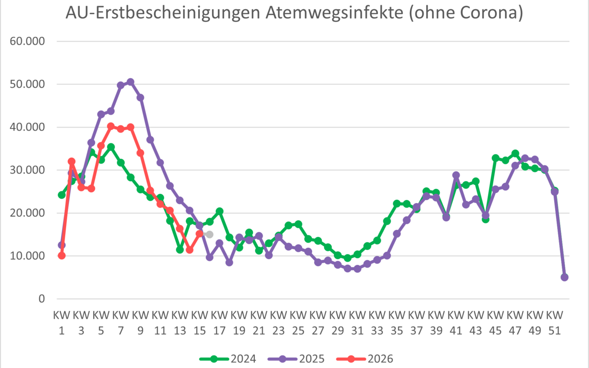 | Krankschreibungen aufgrund von Atemwegsinfektionen (ohne Corona-Fälle) | 22.038 | 20.561 | 16.346 | 11.364 | 15.202 | 14.996 |