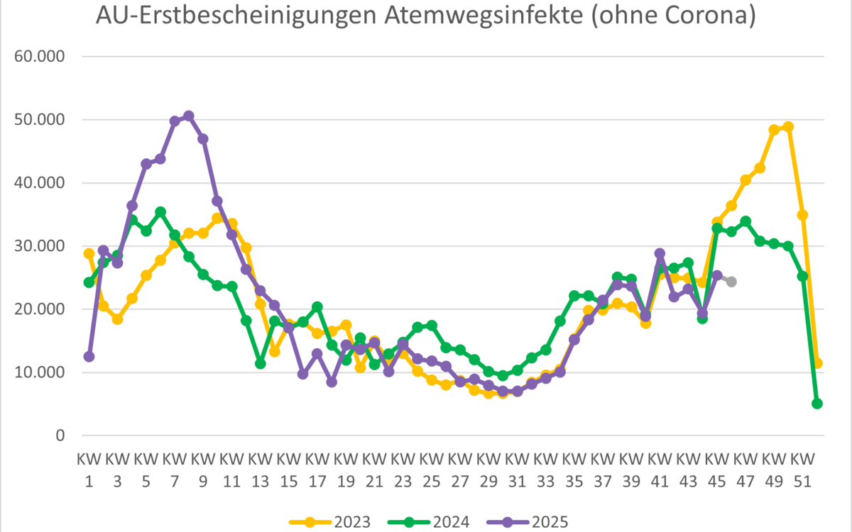 | Krankschreibungen aufgrund von Atemwegsinfektionen (ohne Corona-Fälle) | 28.795 | 21.905 | 23.171 | 19.346 | 25.372 | 24.322 |