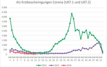 - Personen mit fortbestehender Arbeitsunfähigkeit mit Erkrankungsbeginn in den Vorwochen (sog. Folgebescheinigungen) hier nicht enthalten, Aussagen zur Dauer der Krankschreibungen und zur Erkrankungsschwere daher hier nicht ableitbar.