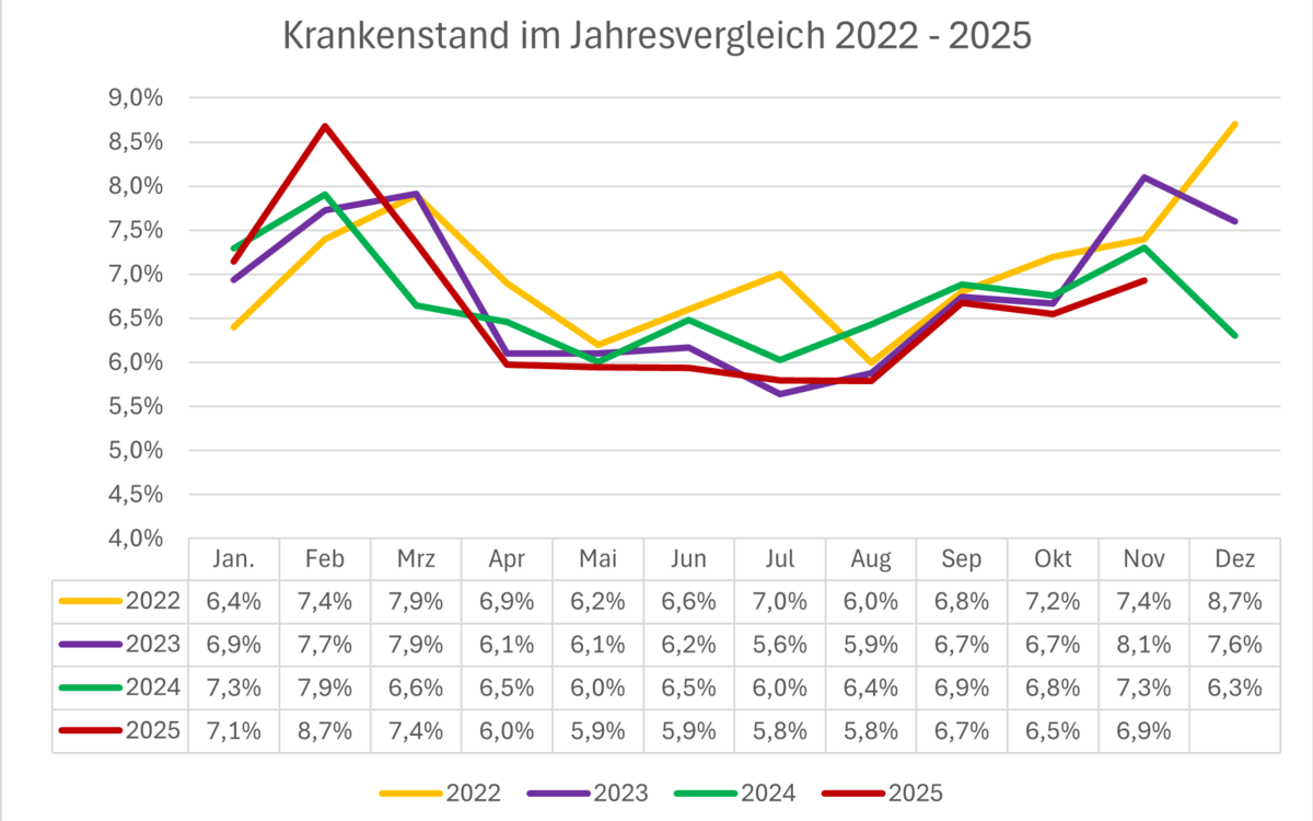 Abbildung 2 vergleicht die Entwicklung der Krankenstände der Jahre 2022 bis 2025. Der hohe Krankenstand in 2022 wurde in den Folgejahren nicht wieder erreicht, sondern sank auf 6,8 Prozent (2023), 6,7 Prozent (2024) und auf 6,6 Prozent in 2025. Deutlich zu erkennen sind die üblichen jahreszeitliche Schwankungen, ebenso wie die Effekte der letzten hohe Coronawelle Ende 2022 als auch die Auswirkung einer stärker ausgeprägten Grippewelle zu Beginn 2025.