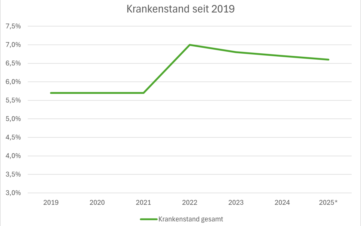 | Krankenstand gesamt | 5,7% | 7,0% | 6,8% | 6,7% | 6,6% |