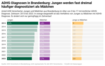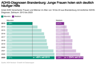 Im Jahr 2013 wurden männliche Brandenburger im Alter von 18 bis 24 noch mehr als dreimal so häufig mit ADHS diagnostiziert wie erwachsene Brandenburgerinnen dieser Altersgruppe. Im Jahr 2023 lagen Männer in dieser Altersgruppe bei rund 2,4 Prozent, bei Frauen bei rund 1,4 Prozent.
