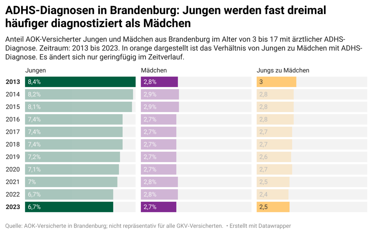 Die Datenanalyse zeigt: Bei Kindern und Jugendlichen bleiben die Raten der ADHS-Diagnosen in Brandenburg über die Jahre stabil. Rund 6,7 Prozent der Jungen hatten 2023 eine ADHS-Diagnose, aber nur rund 2,7 Prozent der Mädchen. Expertinnen und Experten gehen jedoch davon aus, dass Mädchen in gleichem Ausmaß wie Jungen von ADHS betroffen sind.