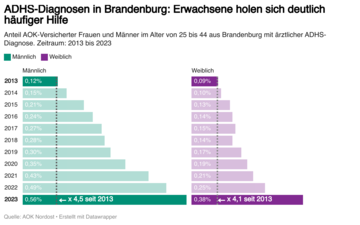 Im Jahr 2013 hatten nur 0,11 Prozent der AOK-versicherten erwachsenen Menschen in Brandenburg eine ADHS-Diagnose. 2023 waren es bereits 0,29 Prozent. Beim Blick auf die Geschlechter fällt auf, dass sich die Diagnosehäufigkeit von Männern und Frauen angenähert hat.
