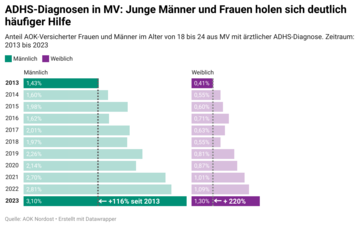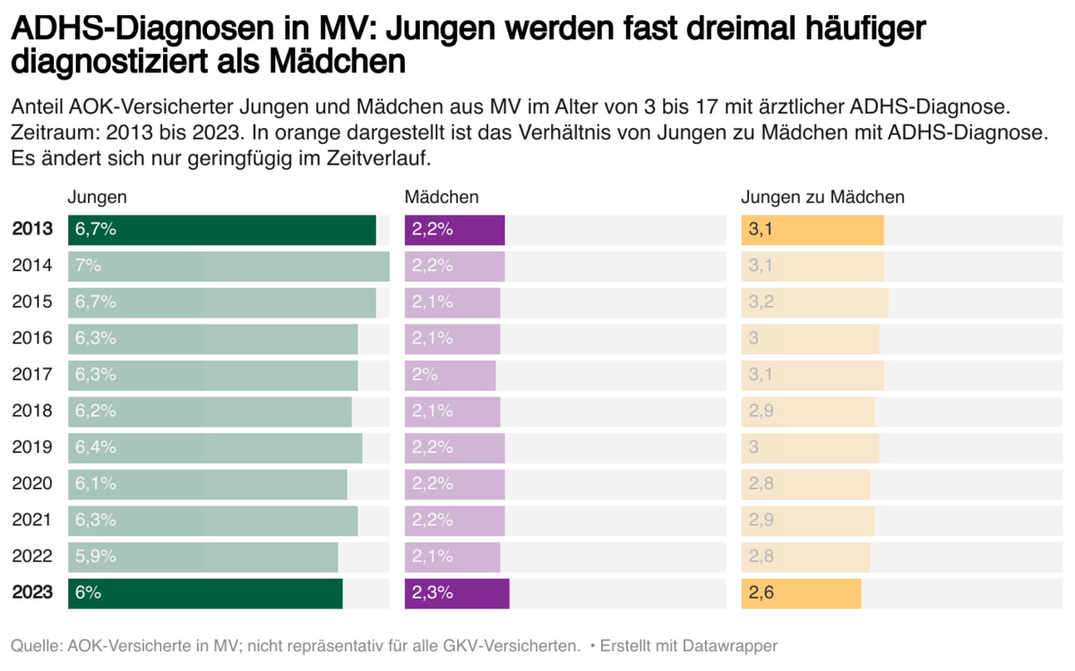 Die Datenanalyse zeigt: Bei Kindern und Jugendlichen bleiben die Raten der ADHS-Diagnosen in MV über die Jahre stabil. Rund 6,0 Prozent der Jungen hatten 2023 eine ADHS-Diagnose, aber nur rund 2,3 Prozent der Mädchen. Expertinnen und Experten gehen jedoch davon aus, dass Mädchen in gleichem Ausmaß wie Jungen von ADHS betroffen sind.