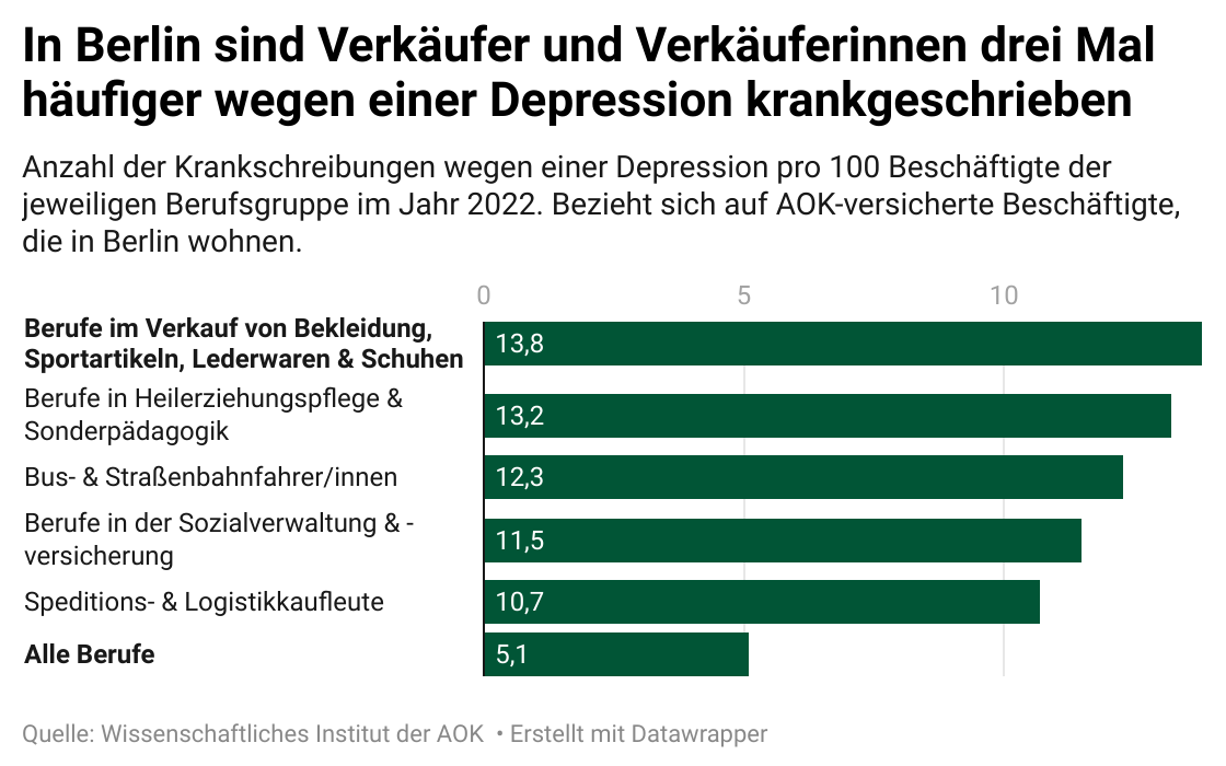 Der Gesundheitsatlas verdeutlicht auch, dass Depressionen hohe gesellschaftliche Folgekosten nach sich ziehen. So fielen AOK-Versicherte Berliner Beschäftigte, die sich im Jahr 2022 wegen einer Depression arbeitsunfähig melden mussten, im Schnitt für 36 Tage aus – also mehr als fünf Wochen am Stück. Im Vergleich zu anderen Krankheiten sind das überdurchschnittlich lange Fehlzeiten. Am häufigsten meldeten sich in Berlin dabei Verkäuferinnen und Verkäufer wegen einer Depression krank. Auf 100 Beschäftigte dieser Berufsgruppe kamen im Jahr 2022 dabei rund 14 Krankmeldungen wegen einer Depression – fast drei Mal häufiger als im Durchschnitt aller Beschäftigten in Berlin. Auch Beschäftigte in der Heilerziehungspflege und Sonderpädagogik sowie Fahrerinnen und Fahrer von Bussen, Straßenbahnen und U-Bahnen waren überdurchschnittlich häufig von Depressionen betroffen.