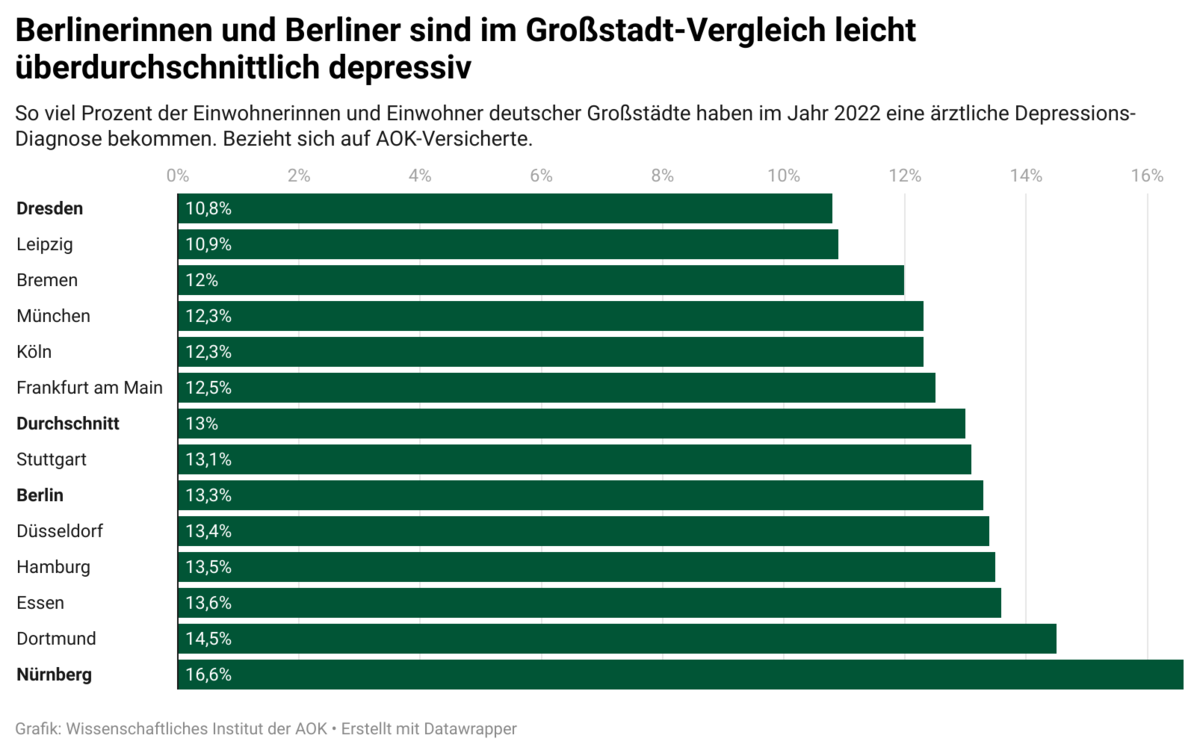 Der Gesundheitsatlas zeigt, dass 13,3 Prozent der AOK Die AOK hat mit mehr als 20,9 Millionen Mitgliedern (Stand November 2021) als zweistärkste Kassenart… -Versicherten Berlinerinnen und Berliner im Jahr 2022 eine ärztliche Depressions-Diagnose erhalten haben. Im Vergleich mit den zwölf anderen deutschen Großstädten mit mehr als 500.000 Einwohnerinnen und Einwohnern liegt Berlin damit leicht über dem Durchschnitt von 13 Prozent.