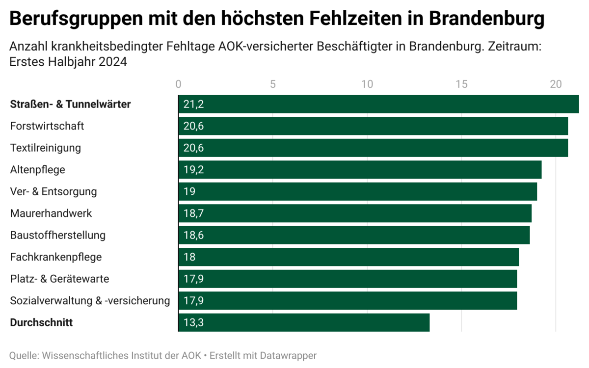 So fehlten nicht nur Straßen- und Tunnelwärter rund 60 Prozent häufiger bei der Arbeit als Brandenburger Durchschnitts-Beschäftige (21,1 Fehltage im ersten Halbjahr im Vergleich zu 13,3). Auch Beschäftigte in der Forstwirtschaft und in der Textilreinigung kamen im Schnitt auf 20,6 Fehltage. Dahinter folgen Beschäftigte in der Altenpflege (19,2 Fehltage) und in der Ver- und Entsorgung (19 Fehltage). Es sind allesamt körperlich anstrengende Berufe.