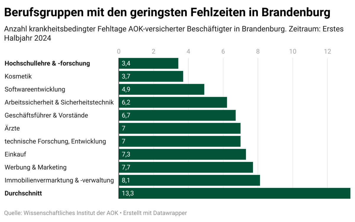 Die geringsten Fehlzeiten wiesen AOK-versicherte Brandenburger Beschäftigte in Hochschullehre- und Forschung aus. Sie fehlten im Schnitt nur an 3,4 Tagen im ersten Halbjahr – rund viermal seltener als im Schnitt. Geringe Fehlzeiten hatten auch Beschäftigte in der Kosmetik (3,7 Fehltage), der Softwareentwicklung (4,9 Fehltage) und Beschäftigte in der Arbeitssicherheit und Sicherheitstechnik (6,2 Fehltage).