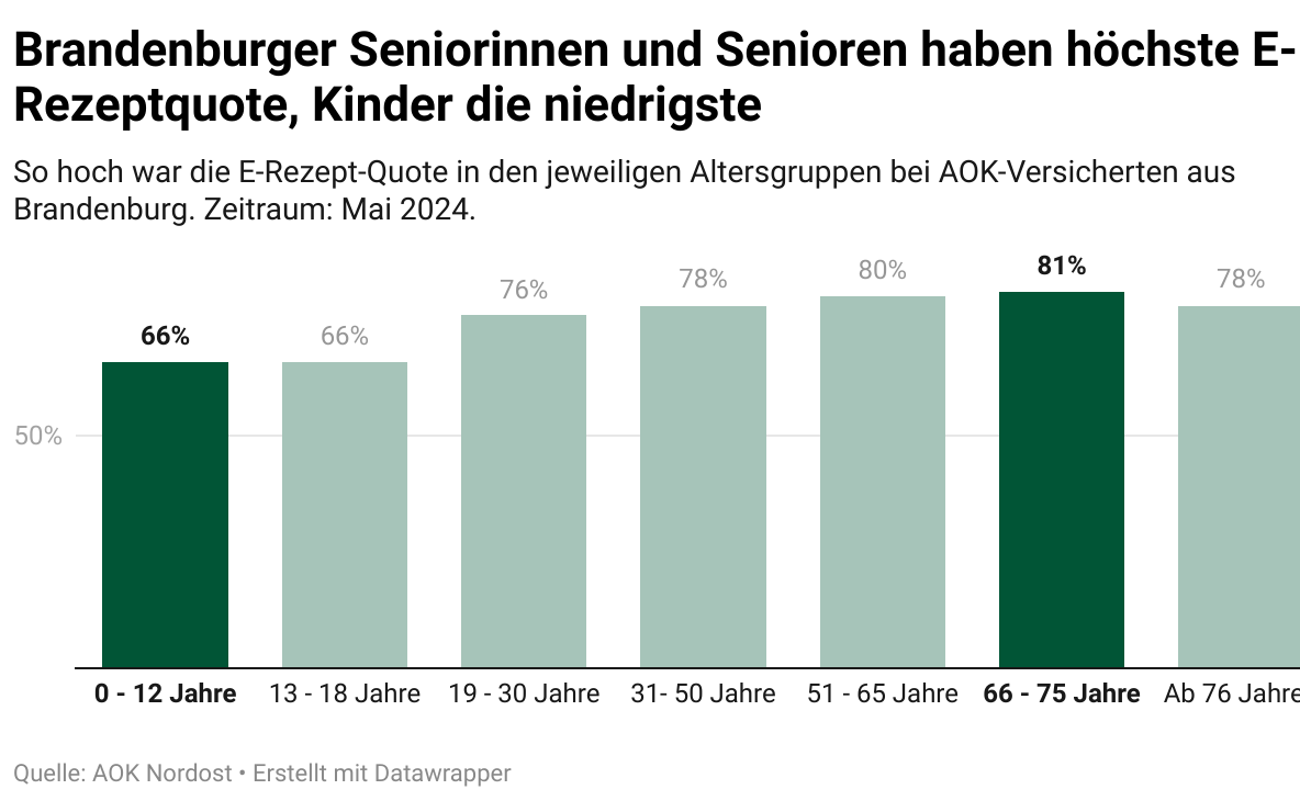 In Brandenburg nutzen Seniorinnen und Senioren das E-Rezept am häufigsten. Das geht aus einer Datenanalyse der AOK Nordost hervor. Demnach erhielten die „Silver Surfer“ im Mai dieses Jahres 81 Prozent aller Arzneimittelpackungen per elektronischem Rezept. Bezogen auf alle Altersgruppen lag die E-Rezeptquote in Brandenburg bei 79 Prozent.