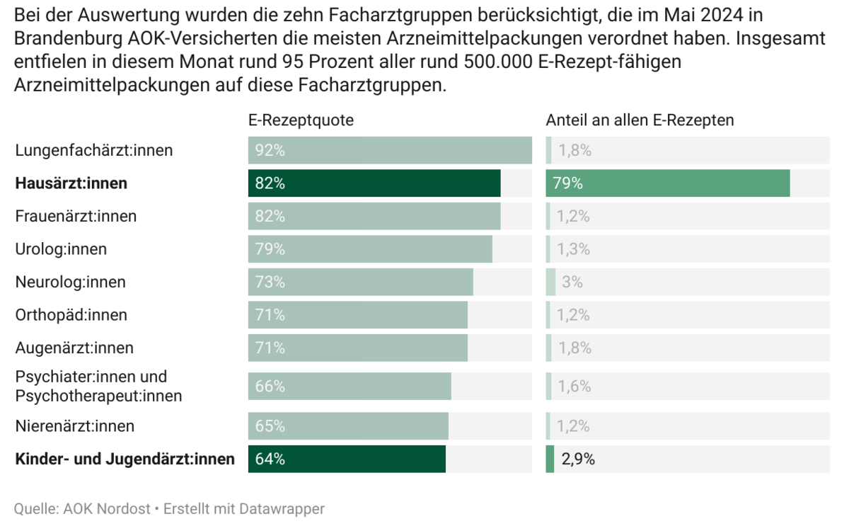 Bei den Brandenburger Kinderärztinnen und –ärzten war die E-Rezeptquote mit 64 Prozent deutlich niedriger. Ein Grund: Kinder und Jugendlichen bekommen viel seltener dauerhaft Arzneimittel verordnet. Bei Arzneimitteln zur Akutversorgung - zum Beispiel bei Antibiotika - ist die E-Rezeptquote niedriger als bei Dauermedikation.