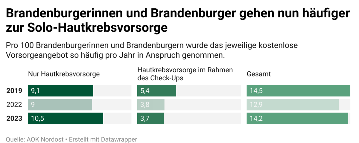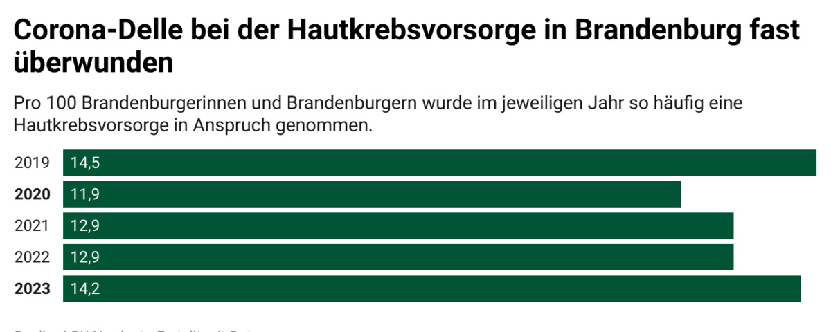 Wie die AOK-Datenanalyse zeigt, ließen im Jahr 2023 rund 14 Prozent der anspruchsberechtigten Brandenburgerinnen und Brandenburger eine Hautkrebsvorsorge durchführen. Das sind rund ein Fünftel mehr Menschen als noch im ersten Coronajahr 2020. Damals lag die Teilnahmequote bei knapp 12 Prozent, vor der Pandemie bei 14,5 Prozent. Diese Zahlen sind repräsentativ für alle Menschen mit einer gesetzlichen Krankenversicherung.
