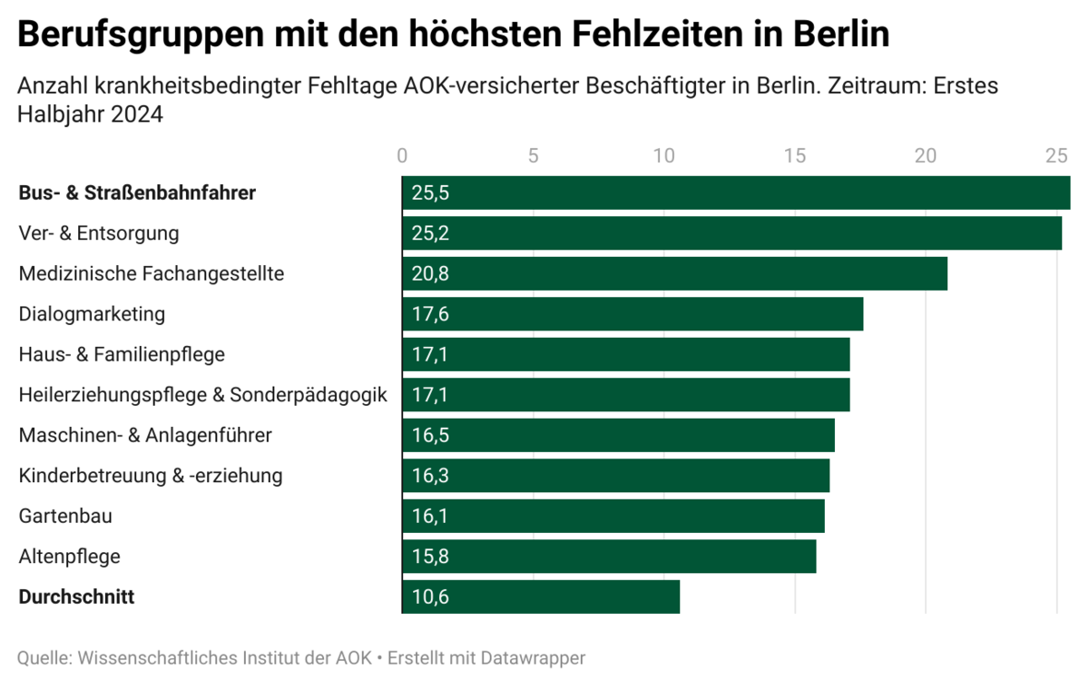 So fehlten nicht nur Bus- und Straßenbahnfahrer rund zweieinhalb Mal häufiger bei der Arbeit als Berliner Durchschnitts-Beschäftige (25,5 Fehltage im ersten Halbjahr im Vergleich zu 10,5). Auch Beschäftigte in der Ver- und Entsorgung kamen im Schnitt auf 25,2 Fehltage. Dahinter folgen medizinische Fachangestellte, früher Arzthelferinnen genannt (20,8 Fehltage), Beschäftigte im Dialogmarketing (17,6 Fehltage) und in der Haus- und Familienpflege (17,1 Fehltage).