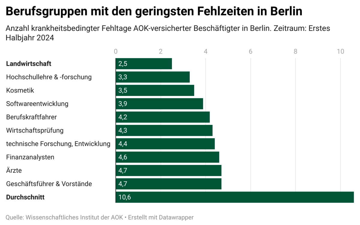 Die geringsten Fehlzeiten wiesen AOK-versicherte Berliner Beschäftigte in der Landwirtschaft auf. Sie fehlten im Schnitt nur an 2,5 Tagen im ersten Halbjahr – rund viermal seltener als im Schnitt. Geringe Fehlzeiten hatten auch Beschäftigte in der Hochschullehre- und Forschung (3,3 Fehltage), der Kosmetik (3,5 Fehltage), der Softwareentwicklung (3,9 Fehltage) und Berufskraftfahrer (4,2 Fehltage).