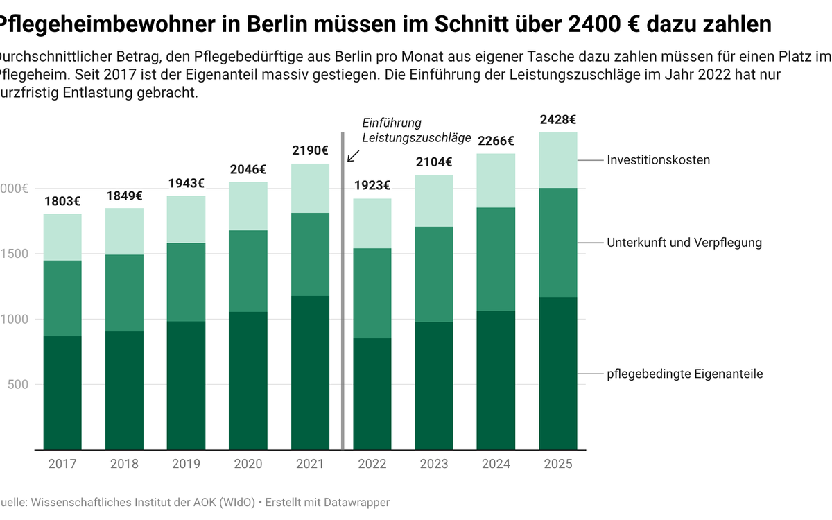 Ein Betrag, der häufig deutlich über der verfügbaren Rente liegt. Die durchschnittliche Altersrente nach 35 Jahren Versicherungsjahren betrug im Ostteil Berlins Ende 2024 laut Rentenatlas 1756 Euro und im Westen Berlins 1631 Euro. Die Folgen sind bereits heute deutlich sichtbar: Rund 17.300 Menschen, die in Pflegeeinrichtungen in Berlin versorgt werden erhielten bereits 2024 Hilfe zur Pflege, weil Einkommen und Vermögen nicht ausreichten, um die Pflegekosten zu tragen.