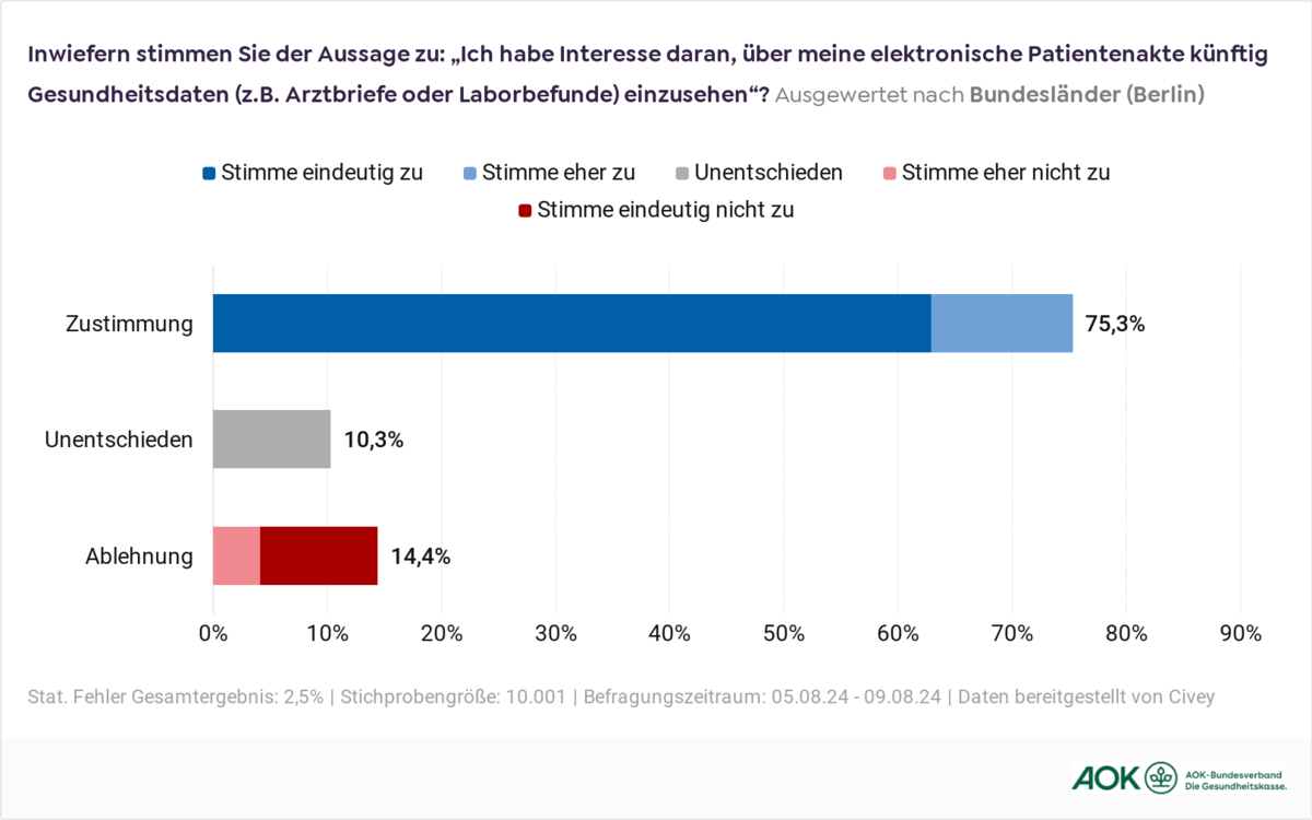 75 Prozent der Berlinerinnen und Berliner haben Interesse daran, über ihre elektronische Patientenakte (ePA) künftig Gesundheitsdaten einzusehen. Das zeigt eine Civey-Umfrage im Auftrag der AOK Nordost. Die Gesundheitskasse schreibt derzeit all ihre Berliner Versicherten an, um sie über die im kommenden Jahr startende „ePA für alle“ zu informieren. Die Widerspruchsquote der Berliner Versicherten liegt bislang unter einem Prozent.