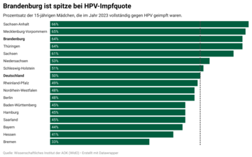 Zum Vergleich: Im Bundesschnitt waren 2024 lediglich rund 49 Prozent der 15-jährigen Mädchen vollständig gegen HPV geimpft – rund 15 Prozentpunkte weniger als in Brandenburg.