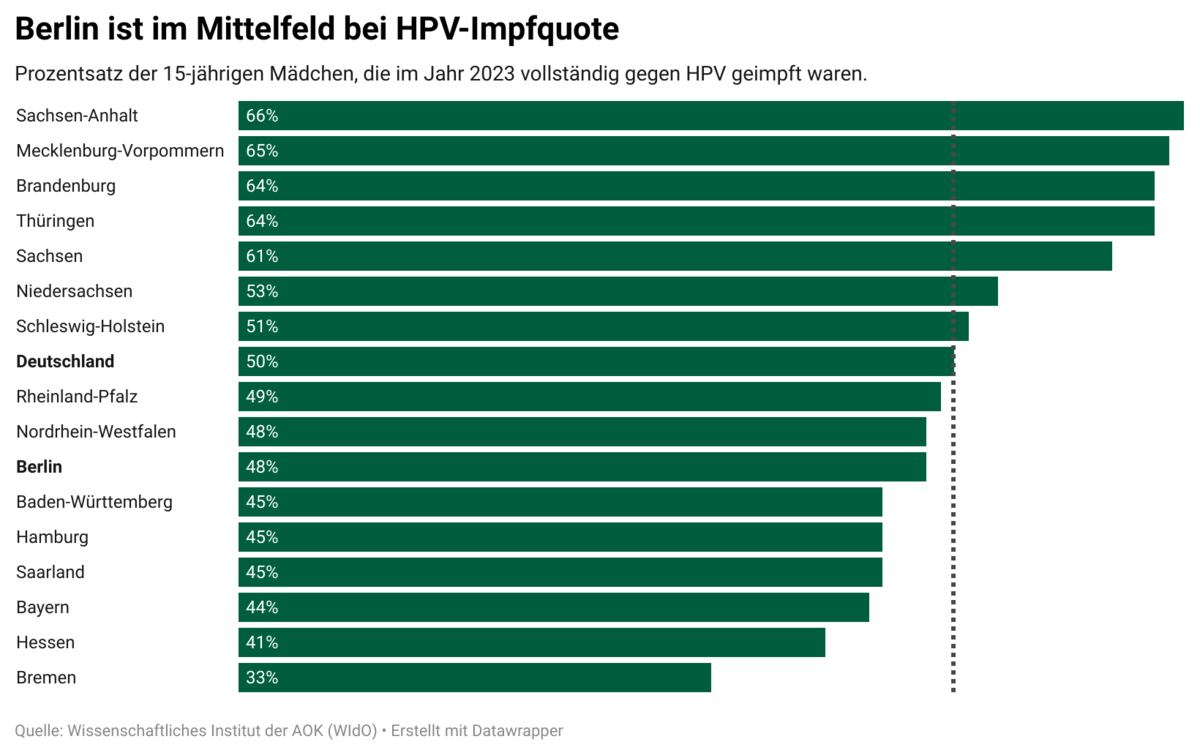 Zum Vergleich: Im Bundesschnitt waren 2024 rund 49 Prozent der 15-jährigen Mädchen vollständig gegen HPV geimpft.