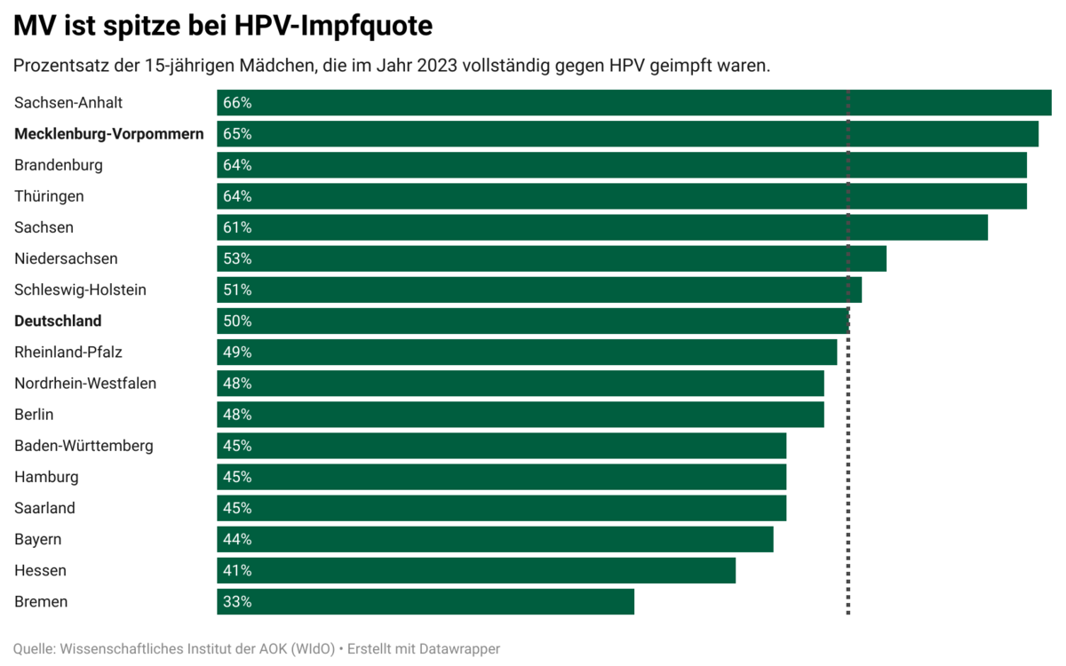 Zum Vergleich: Im Bundesschnitt waren 2024 lediglich rund 49 Prozent der 15-jährigen Mädchen vollständig gegen HPV geimpft – rund 16 Prozentpunkte weniger als in MV.