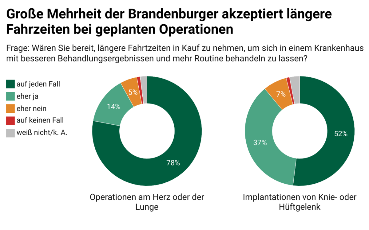 Laut dieser Umfrage sind 78 Prozent der Brandenburgerinnen und Brandenburger bereit, für risikoreiche Eingriffe wie Herz- oder Lungen-OPs auf jeden Fall längere Fahrtzeiten in Kauf zu nehmen – wenn dadurch bessere Behandlungsergebnisse zu erwarten sind. Auch bei weniger riskanten Eingriffen – etwa künstlichem Knie- oder Hüftgelenk – würden fast 90 Prozent der Befragten längere Anfahrtswege akzeptieren: 52 Prozent auf jeden Fall, 37 Prozent eher ja.