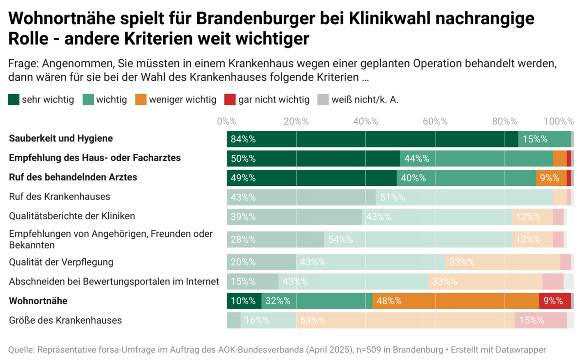 „Es hat sich erfreulicherweise herumgesprochen, dass die höhere Überlebenswahrscheinlichkeit an Krebszentren empirisch nachgewiesen ist. Die Wohnortnähe spielt hingegen nur eine untergeordnete Rolle für die Menschen in Brandenburg, wenn es um planbare Operationen geht“, so Teichert.Nur 10 Prozent der Brandenburgerinnen und Brandenburger halten die Nähe zum Wohnort laut forsa-Umfrage für sehr wichtig. Weit wichtiger sind Sauberkeit und Hygiene (83 Prozent), die Empfehlung des Haus- oder Facharztes (50 Prozent) und der Ruf des behandelnden Arztes (49 Prozent).