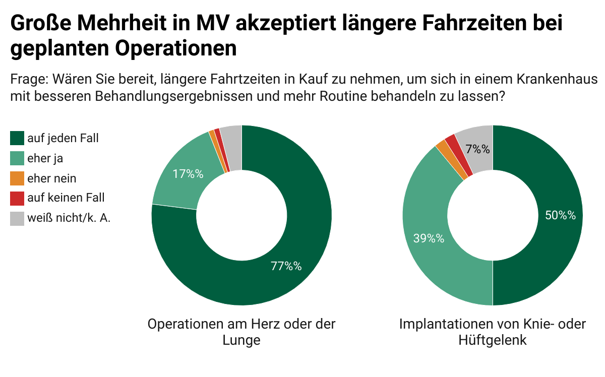 Laut dieser Umfrage sind 77 Prozent der Menschen in MV bereit, für risikoreiche Eingriffe wie Herz- oder Lungen-OPs auf jeden Fall längere Fahrtzeiten in Kauf zu nehmen – wenn dadurch bessere Behandlungsergebnisse zu erwarten sind. Auch bei weniger riskanten Eingriffen – etwa künstlichem Knie- oder Hüftgelenk – würden fast 90 Prozent der Befragten längere Anfahrtswege akzeptieren: 50 Prozent auf jeden Fall, 39 Prozent eher ja.