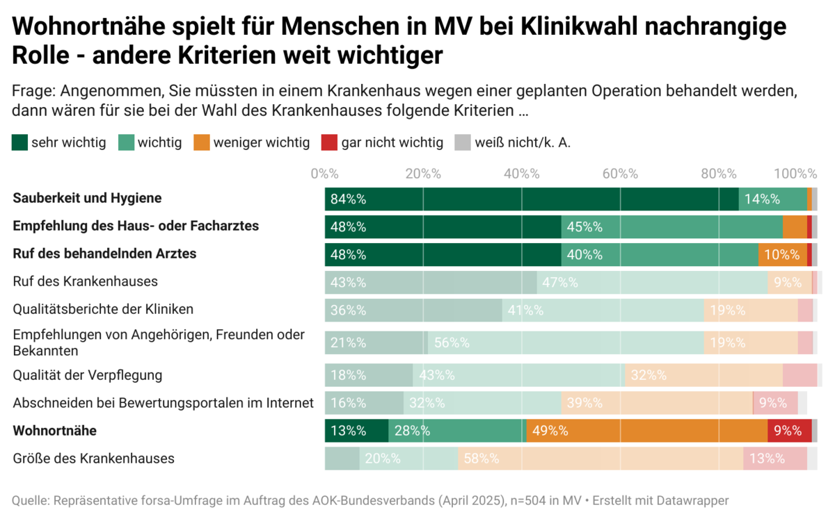 „Es hat sich erfreulicherweise herumgesprochen, dass die höhere Überlebenswahrscheinlichkeit an Krebszentren empirisch nachgewiesen ist. Die Wohnortnähe spielt hingegen nur eine untergeordnete Rolle für die Menschen in MV, wenn es um planbare Operationen geht“, so Teichert.Nur 13 Prozent der Menschen in MV halten die Nähe zum Wohnort laut forsa-Umfrage für sehr wichtig. Weit wichtiger sind Sauberkeit und Hygiene (84 Prozent), der Ruf des behandelnden Arztes (48 Prozent) und die Empfehlung des Haus- oder Facharztes (48 Prozent).