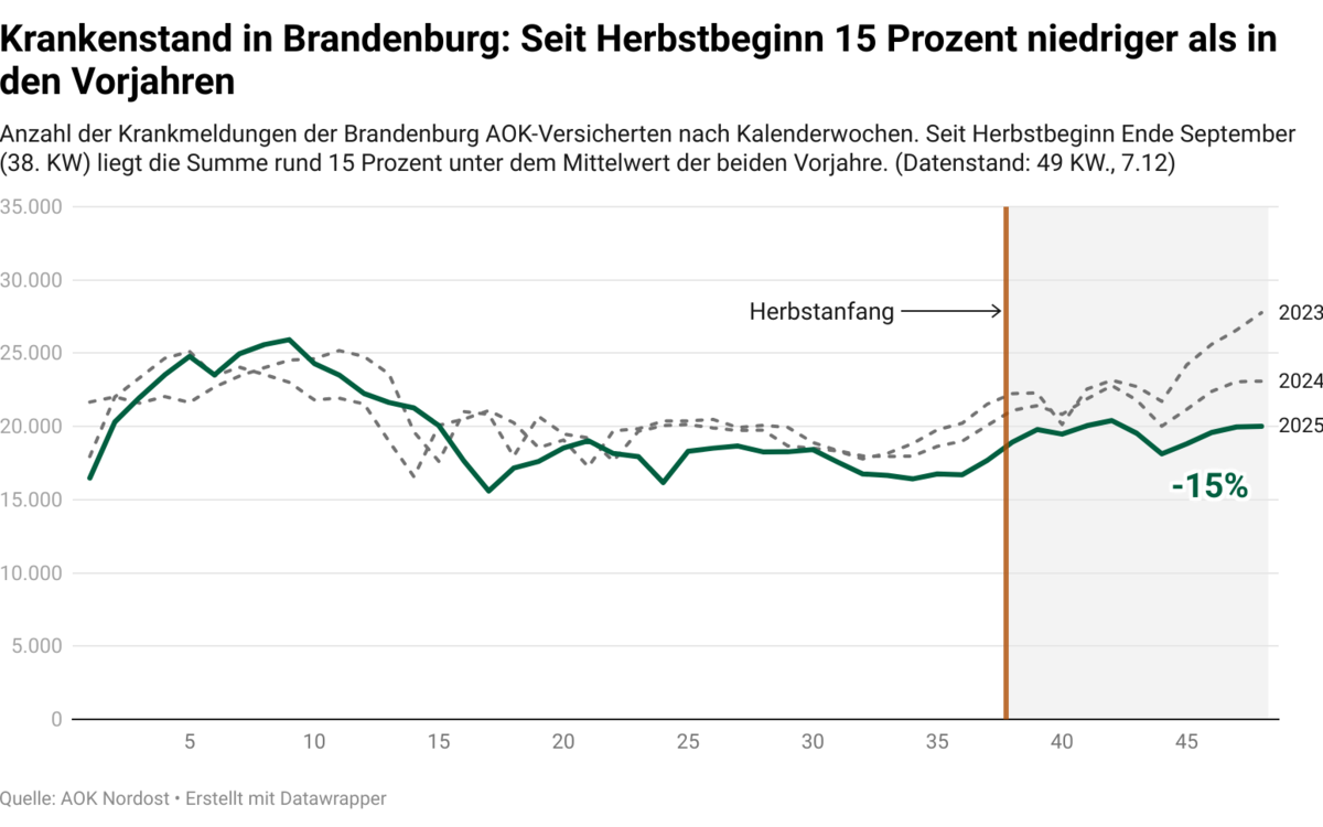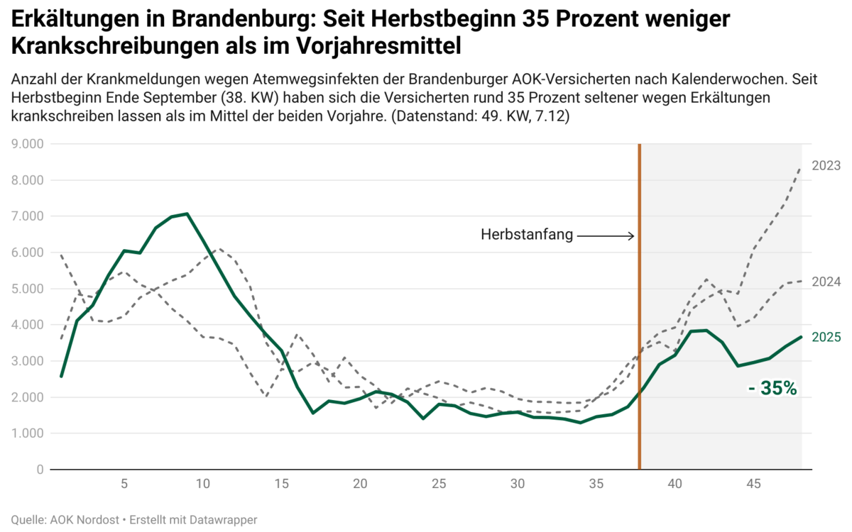 Besonders deutlich zurückgegangen sind die Krankschreibungen wegen Infekten der oberen Atemwege. Seit Herbstbeginn gingen im Mittel der Jahre 2023/2024 rund 61.000 solcher Krankschreibungen von Brandenburger Versicherten bei der AOK Nordost ein. In diesem Jahr waren es rund 40.000 – ein Minus von rund 35 Prozent.