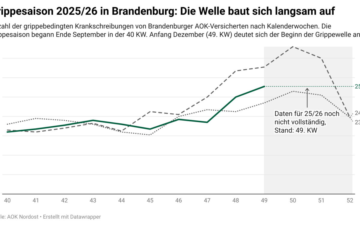 Die Grippekrankmeldungen seit Herbstbeginn liegen in Brandenburg derzeit noch rund 4 Prozent unter dem Vorjahresmittel. Insgesamt gingen seit der 40. Kalenderwoche rund 780 Grippe-Krankmeldungen von Brandenburger Versicherten bei der AOK Nordost ein. In den Kalenderwochen 47 bis 49 stieg die Zahl der Grippe-Krankmeldungen bei Brandenburger AOK-Versicherten jedoch von 74 auf 111 pro Woche an. Damit bestätigen die AOK-Zahlen die Ergebnisse der Überwachung des Robert Koch-Instituts, die ebenfalls noch moderate Grippezahlen in dieser Kalenderwoche sehen – aber eine steigende Tendenz.