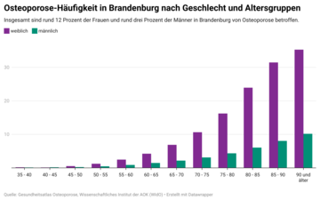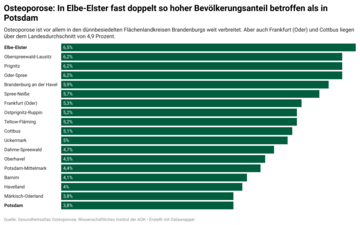Die Osteoporose-Häufigkeit liegt in Brandenburg damit knapp ein Viertel über dem Bundesdurchschnitt. Am niedrigsten ist die Krankheitshäufigkeit in Hamburg mit 2,9 Prozent, am höchsten in Sachsen-Anhalt mit 5,8 Prozent.