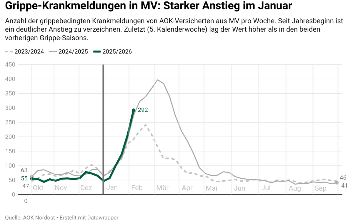 Zum Start der Winterferien hat die Grippewelle in MV an Fahrt aufgenommen. Im Januar fehlten mehr Menschen grippebedingt im Job als in den Vorjahren. Und im Vergleich zum Jahresbeginn haben sich die Grippe-Krankmeldungen zuletzt sogar verfünffacht. Das zeigt eine Auswertung der AOK Die AOK hat mit mehr als 20,9 Millionen Mitgliedern (Stand November 2021) als zweistärkste Kassenart… Nordost, der größten Krankenkasse in MV.