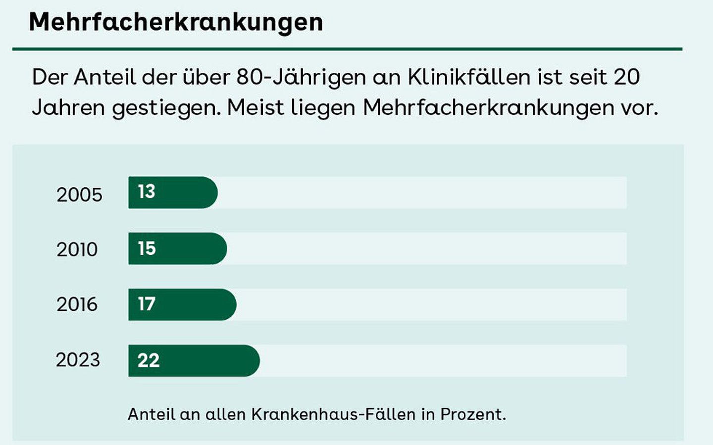 Viele Kliniken sind aktuell nicht gut gerüstet für die Versorgung hochbetagter Menschen, die meist an mehreren Erkrankungen gleichzeitig leiden und im Durchschnitt höheren Aufwand verursachen. Der Krankenhausreport des Wissenschaftlichen Instituts der AOK (WIdO) zeigt Ansätze auf, wie die Versorgungsstrukturen verbessert werden können, um eine Überforderung der Kliniken und massive Ausgabensteigerungen in den nächsten Jahren zu verhindern.