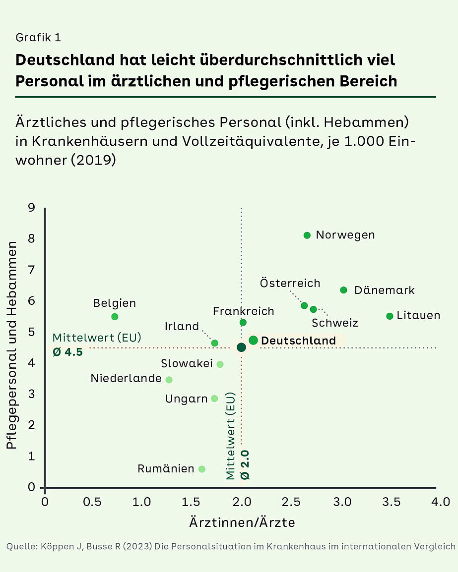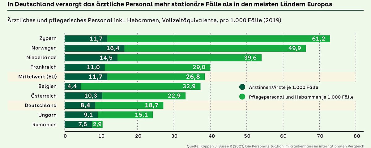 Das Personal in deutschen Kliniken versorgt mehr Fälle als im europäischen Vergleich. Der Bedarf nach medizinischen Fachkräften dürfte in den kommenden Jahren weiter steigen. Obwohl Deutschland laut WIdO-Krankenhaus-Report im europäischen Vergleich insgesamt etwas mehr medizinisches und pflegerisches Personal einsetzt (Grafik 1), besteht gerade in den Kliniken akuter Handlungsbedarf. Denn bezogen auf die Fallzahl zeigt sich, dass Ärzte und Pflegekräfte in Deutschland im Schnitt mehr Fälle versorgen müssen als ihre Kolleginnen und Kollegen in anderen europäischen Ländern. Der Mittelwert liegt bei rund zwölf Ärztinnen und Ärzten sowie 27 Pflegekräften pro 1.000 Fälle. Deutschland liegt hier deutlich darunter und belegt mit etwa acht Ärztinnen und Ärzten und knapp 19 Pflegekräften pro 1.000 Fälle den drittletzten Platz (Grafik 2). Um hier für Entlastung zu sorgen, müssten unter anderem nicht notwendige Krankenhauseinweisungen reduziert, das Ambulantisierungspotenzial besser ausgeschöpft und die im Vergleich hohe Krankenhausverweildauer gesenkt werden. Experten gehen davon aus, dass einige langfristige Trends die Personalsituation in den nächsten Jahren verschärfen. Dazu gehört vor allem die ungünstige demografische Entwicklung, die den Fachkräftemangel im medizinischen und pflegerischen Bereich weiter verstärken wird.