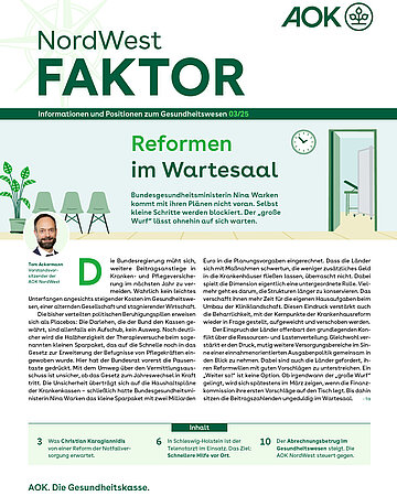In der Ausgabe 2/2025 des NordWest FAKTORs blickt Tom Ackermann kritisch auf den vorliegenden Herbst der Reformen und fordert klare Strukturentscheidungen. Oliver Blatt - Vorstandsvorsitzender des GKV-Spitzenverbandes - zeigt im Interview auf, welchen Handlungsbedarf er für das Gesundheitswesen sieht.
