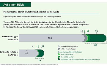 Rund 13.000 Verdachtsfälle auf Medizinschäden, die der Medizinische Dienst (MD) im Jahr 2021 im Auftrag der Krankenkassen zu prüfen hatte, sind bundesweit bekannt. In Schleswig-Holstein und Westfalen-Lippe begutachtete der MD insgesamt 522 Fälle (siehe Grafik). Eine hohe Dunkelziffer wird vom MD vermutet. Er geht davon aus, dass nur drei Prozent der tatsächlichen Fälle nachverfolgt werden, weil der Patient den Behandlungsfehler nicht erkennt. Behandelnde sollten deshalb gesetzlich dazu verpflichtet werden, Patientinnen und Patienten über Umstände, die die Annahme eines Behandlungsfehlers begründen, generell ohne Nachfrage zu informieren.